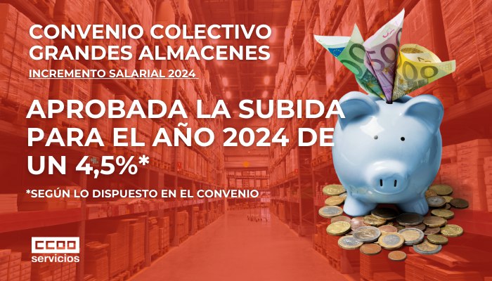 En el día de hoy, 9 de enero 2024, la comisión mixta del convenio colectivo de grandes almacenes ha aprobado la subida para el año 2024 de un 4,5%, según lo dispuesto en el convenio.
