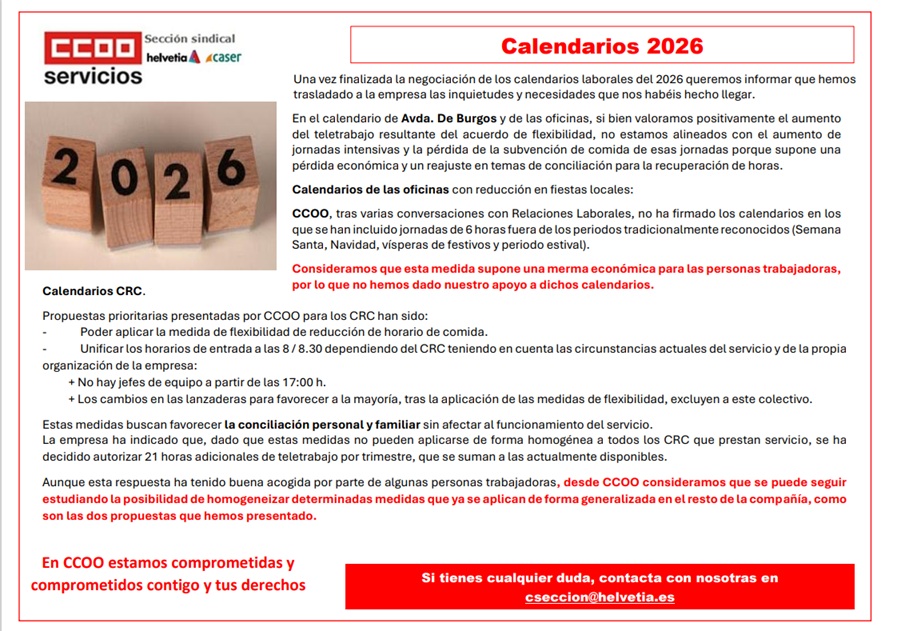Una vez finalizada la negociación de los calendarios laborales del 2026 queremos informar que hemos trasladado a la empresa las inquietudes y necesidades que nos habéis hecho llegar. En el calendario de Avda. de Burgos y de las oficinas, si bien valoramos positivamente el aumento del teletrabajo resultante del acuerdo de flexibilidad, no estamos alineadas con el aumento de jornadas intensivas y la pérdida de la subvención de comida de esas jornadas porque supone una pérdida económica y un reajuste en temas de conciliación para la recuperación de horas.