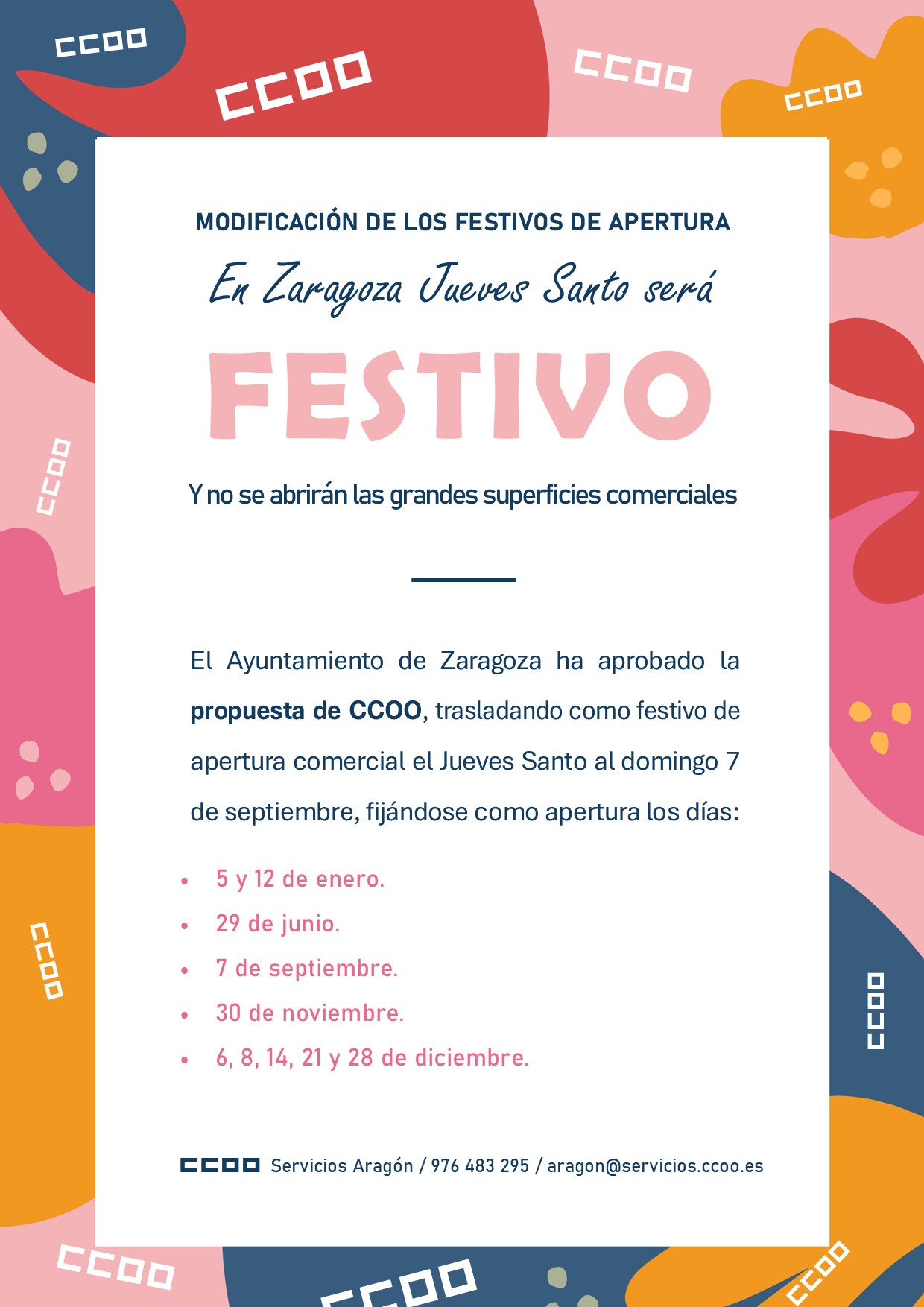 El Ayuntamiento de Zaragoza ha aprobado la propuesta de CCOO, trasladando como festivo de apertura comercial el Jueves Santo al domingo 7 de septiembre, por lo que las personas trabajadoras del comercio en Zaragoza dispondremos de dos días festivos consecutivos en abril.