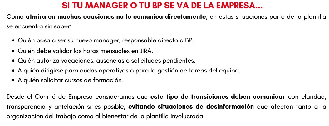 En las últimas semanas hemos detectado varias situaciones en las que, en los casos de salida de manager, responsable directo o BP, no se está informando adecuadamente a las personas de los equipos afectados. Esta falta de comunicación está generando incertidumbre y problemas operativos en el día a día.