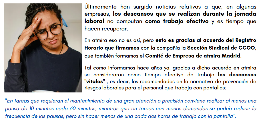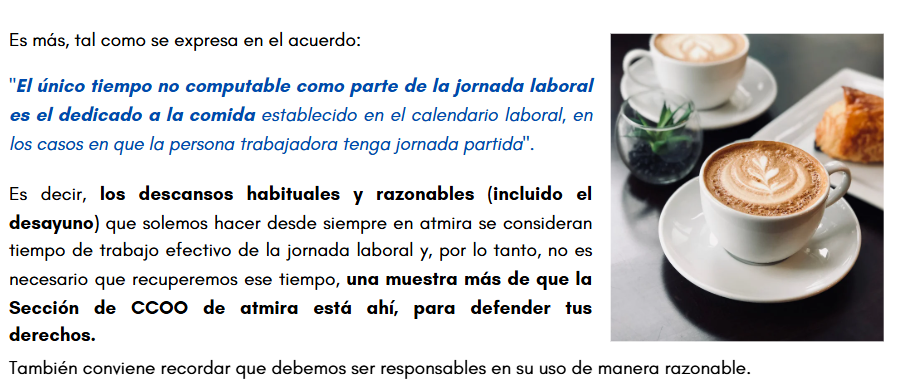 Y finalmente os recordamos que los descansos habituales ( desayuno, pausas de descansos “vitales”, ....) cuentan como trabajo efectivo.