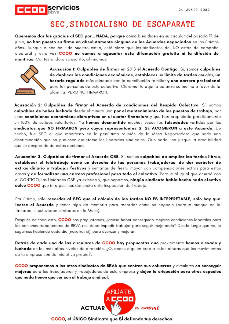 Queremos dar las gracias al SEC por… NADA, porque como bien dicen en su circular del pasado 17 de junio, no han puesto su firma en absolutamente ninguno de los Acuerdos negociados en los últimos años. Aunque nunca ha sido nuestro estilo, está claro que los sindicatos del NO están de campaña electoral y esta vez CCOO no vamos a aguantar esta difamación gratuita ni la difusión de mentiras.