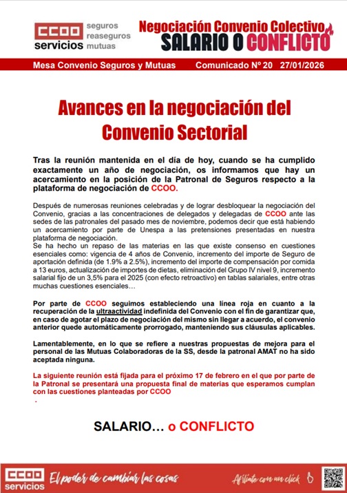 Tras la reunión mantenida en el día de hoy, cuando se ha cumplido exactamente un año de negociación, os informamos que hay un acercamiento en la posición de la Patronal de Seguros respecto a la plataforma de negociación de CCOO.
