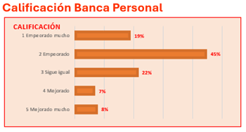 En la función administrativa de Banca de Empresas la valoración es más neutra aunque tiene un ligero tinte negativo. Se están produciendo retrasos en los trámites y no existe una proporcionalidad adecuada entre el personal disponible y la carga de trabajo. Aunque se ha conseguido un mayor control y soporte, estos avances han venido acompañados de una mayor lentitud en los procesos. El impacto es menor que en Banca Personal, pero la carga ha aumentado y la agilidad ha disminuido.