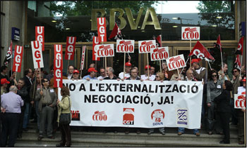 El dimarts, 29 dabril, cinquanta delegats/des dels sindicats al BBVA-Catalunya i un centenar de treballadors de ledifici de Pça. Catalunya, de Barcelona, ens hem concentrat a lentrada del banc per expressar la nostra oposició al PEIT (projectes Velázquez i CLIMA) i en exigència de solucions als nombrosos problemes laborals que sen deriven.