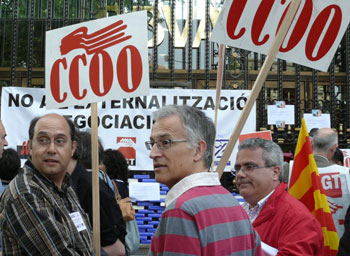 Avui dijous 15 de maig, 500 treballadors i treballadores del BBVA, convocats per Comfia-CCOO i els altres sindicats amb representació a BBVA Catalunya, s'han concentrat a la seu del Banc a la Plaça de Catalunya de Barcelona, per manifestar la seva oposició al Projecte d'Innovació del banc, que pretén subcontratar i deslocalitzar bona part de les tasques que ara es fan a la pròpia entitat, i implantar una nova estructura funcional a la xarxa comercial.