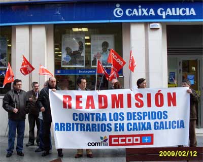 El pasado jueves, 12 de febrero, delegados y delegadas de Comfia - CC.OO. se han concentrado frente a la oficina principal de Caixa Galicia de Gijón, dentro de la campaña de movilizaciones que el sindicato viene organizando en defensa del empleo dentro de la entidad y por la readmisión del compañero despedido.