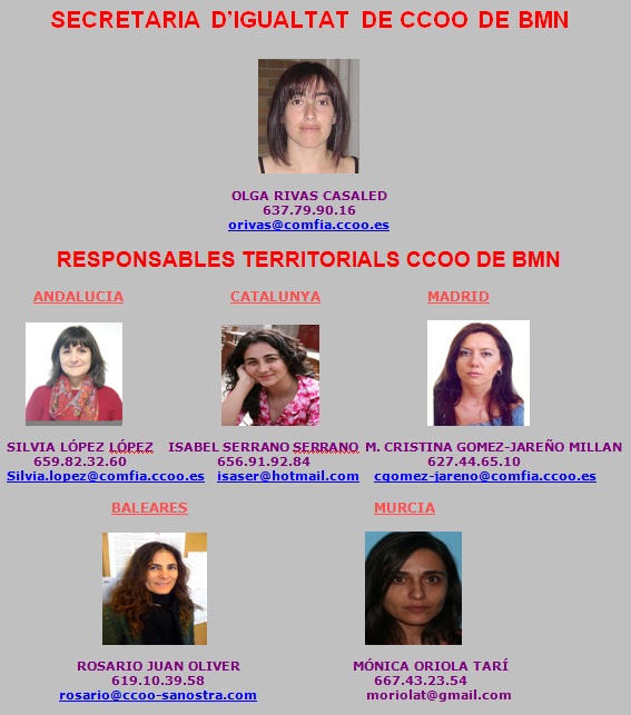 Des de la secció Sindical de CCOO volem felicitar a cadascuna de les nostres companyes de BMN i del grup, i agrair a totes les persones que pel suport i el treball que feu en el dia a dia, participant en la inserció de la dona al món laboral, i en la millora per la igualtat d'oportunitats entre les dones i els homes.