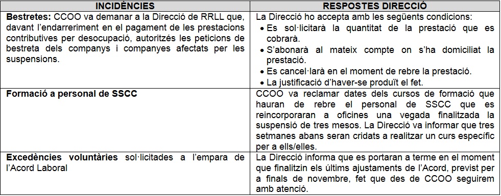 En aquesta reunió es van abordar algunes de les incidències que ens preocupa a CCOO, i que han estat objecte de reiterades reclamacions les últimes setmanes. Aquí us fem esment dalgunes delles: