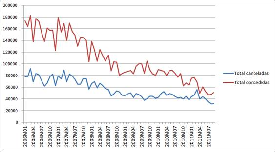 Durante los años 2006 y 2007 la proporción de hipotecas concedidas era más del doble de las canceladas, una vez estallada la burbuja esta proporción se ha reducido hasta tal punto de ser casi el mismo número las hipotecas concedidas y las canceladas.
