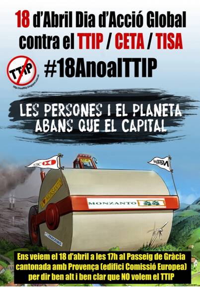 Dicha manifestación tendrá lugar el próximo sábado 18 de abril en Madrid, como parte de la jornada internacional de la lucha contra el TTIP, a partir de las 18:00 horas con el recorrido Neptuno - Puerta del Sol.