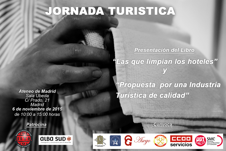 En esta jornada se presentará el libro "Las que limpian los hoteles" elaborado por Alba Sud con el patrocinio de la Regional Latinoamericana de UITA (REL-UITA) y publicado por la Editorial Icaria. Un libro escrito con sentimiento, un grito de denuncia de la situación laboral de un colectivo que las más de las veces resulta invisible en la industria hotelera, pero que, sin embargo, es una de las claves de la calidad del servicio en una industria que es la primera de España, el turismo. Pero es, sobre todo, un libro escrito "desde el sentimiento" de las compañeras protagonistas, de sus problemas cotidianos de salud, de organización del trabajo, de empleo, de salarios o de sus frustraciones y temores, pero también de sus reivindicaciones, de su orgullo por un trabajo que quieren bien hecho, de sus esperanzas y de su rebeldía.