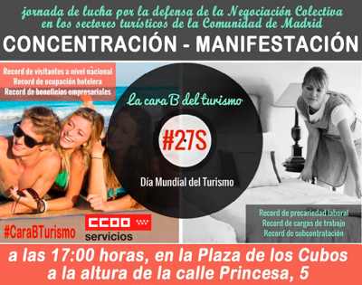 El próximo lunes, 26 de septiembre, a las 10,30 horas, en la sede de CCOO de Madrid (Lope de Vega, 38, 5ª planta), el sindicato convoca una rueda de prensa en la que realizará una valoración de la situación del turismo en la Comunidad de Madrid, en vísperas del Día Internacional del Turismo. En la misma se hará una denuncia de la situación de precariedad que sufren las plantillas, así como del aumento de las externalizaciones, lo que redunda negativamente en el servicio prestado. Asimismo se hará un llamamiento a la manifestación del día 27 en Madrid, en defensa de la negociación colectiva en el sector turístico. En la rueda de prensa intervendrán: Jaime Cedrún, secretario general de CCOO de Madrid Miguel Periáñez, secretario general de la Federación de Servicios de CCOO de Madrid