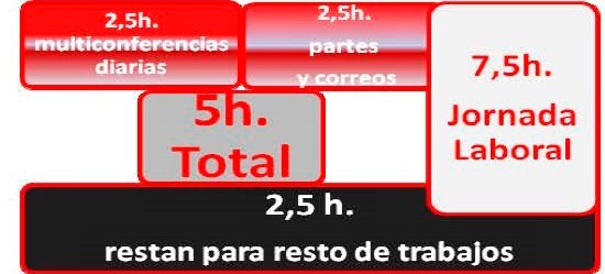 El sentimiento de frustración y decepción que invade a la plantilla es lógico, teniendo en cuenta que cualquier jornada de trabajo puede llevar aparejada 3 multiconferencias, algunas convocadas por la tarde y con solo quince minutos de antelación, unos 25 correos para pedir compromisos, cartera de pedidos, exigencias de qué se va a hacer para mejorar la situación, solicitudes del staff sin tener en cuenta si falta alguna persona en la oficina por motivos varios.
