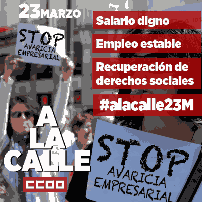 Por salarios dignos, por empleo estable y por la recuperación de los derechos eliminados por las reformas de los Gobiernos y por la avaricia empresarial, CCOO y UGT, llaman a las trabajadoras y trabajadores a impulsar las movilizaciones participando en los actos convocados el 23 de marzo.