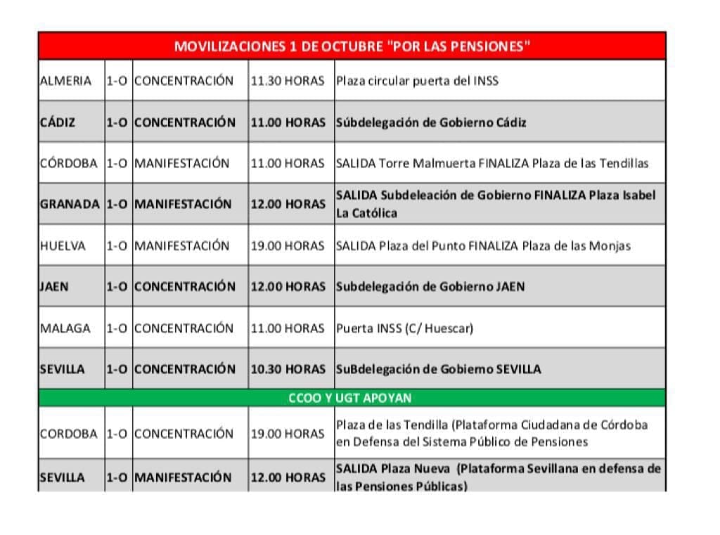 Con motivo de la conmemoración este 1 de Octubre del Día Internacional del Mayor, CCOO y UGT convocan movilizaciones en toda Andalucía para reclamar al Gobierno que la Comisión del pacto de Toledo llegue a un acuerdo para poner en marcha las medidas necesarias para garantizar la sostenibilidad del sistema público de pensiones.