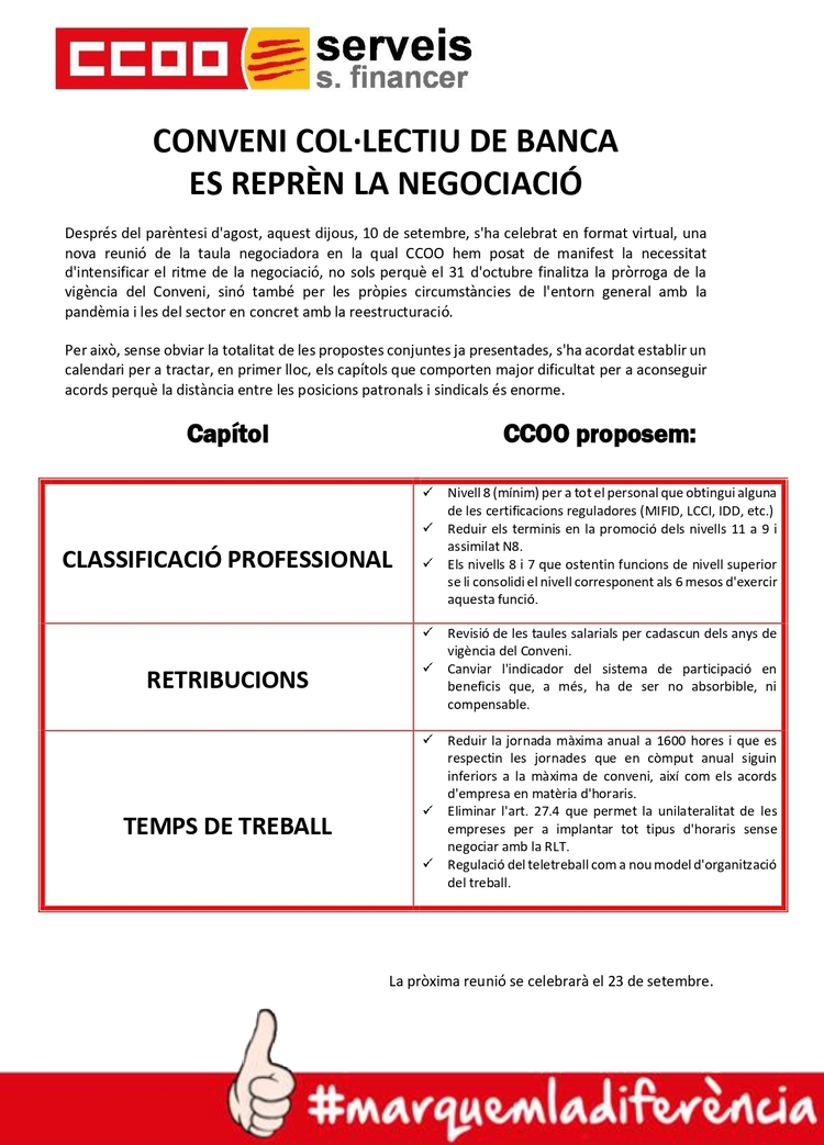 Després del parèntesi d'agost, aquest dijous, 10 de setembre, s'ha celebrat en format virtual, una nova reunió de la taula negociadora en la qual CCOO hem posat de manifest la necessitat d'intensificar el ritme de la negociació, no sols perquè el 31 d'octubre finalitza la pròrroga de la vigència del Conveni, sinó també per les pròpies circumstàncies de l'entorn general amb la pandèmia i les del sector en concret amb la reestructuració.