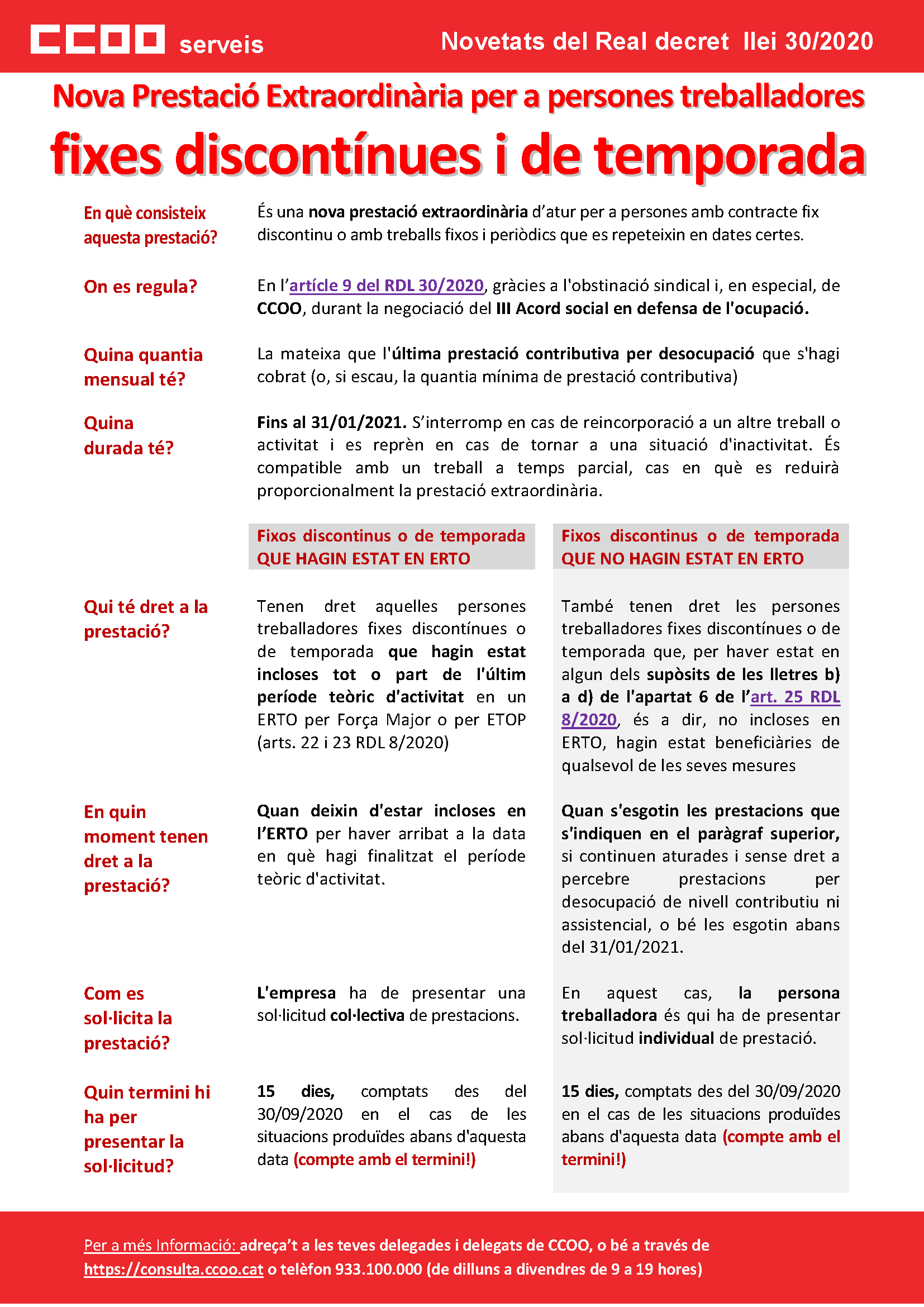 >> Comunicat sobre la prestació que introdueix el RD 30/2020 sobre Fixos Discontinus - guía de la prestació.(PDF català y castellano