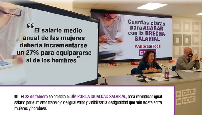 Como se denuncia en el INFORME DE CCOO SOBRE BRECHA SALARIAL DE GÉNERO, presentado en rueda de prensa por la secretaria confederal de Mujeres e Igualdad, Elena Blasco Martín, y el secretario general del sindicato, Unai Sordo, “en nuestro país el salario anual de las mujeres debería incrementarse un 27% para equipararse al de los hombres. De media general, las mujeres ganan 5.726 euros menos que los hombres al año”. Desde CCOO se insiste en la necesidad de actuar frente a esta desigualdad con políticas, recursos y estrategias que incidan sobre los factores estructurales y roles de género que determinan esta discriminación, para que la brecha salarial se sancione y se corrija hasta su total y definitiva erradicación.