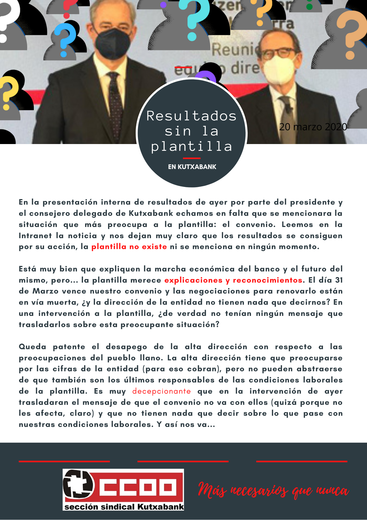Los magníficos resultados de Kutxabank se consiguen sólo por los jefes, al parecer. Ni una mención ni reconocimiento a la plantilla y sus inquietudes y problemáticas.