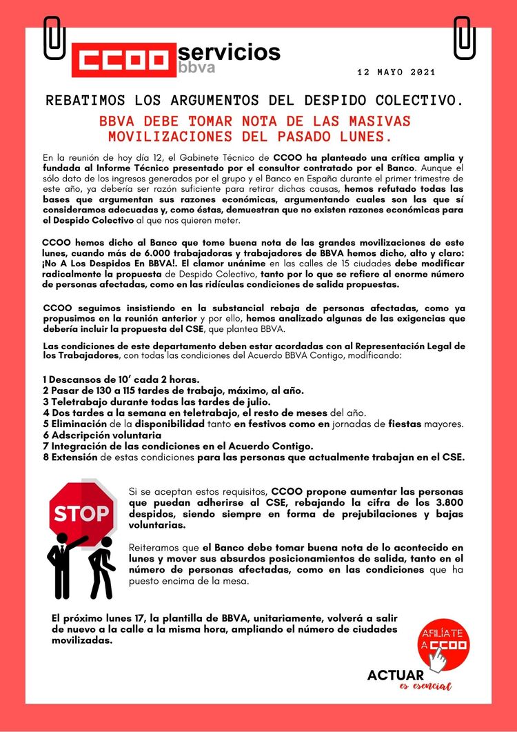 REBATIMOS LOS ARGUMENTOS DEL DESPIDO COLECTIVO. BBVA DEBE TOMAR NOTA DE LAS MASIVAS MOVILIZACIONES DEL PASADO LUNES.