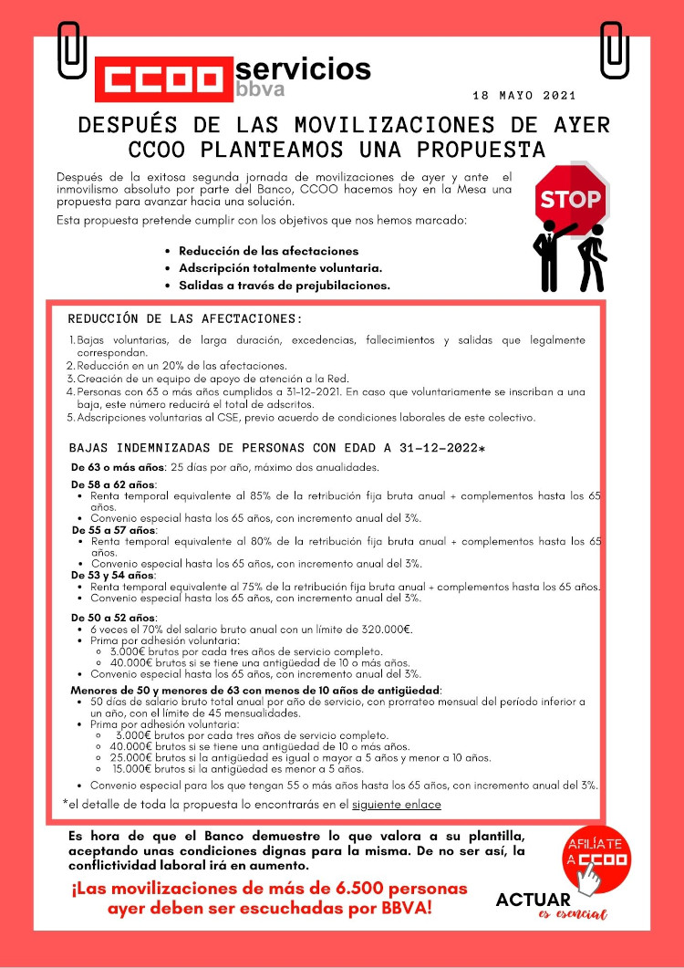 Después de la exitosa segunda jornada de movilizaciones de ayer y ante el inmovilismo absoluto por parte del Banco, CCOO hacemos hoy en la Mesa una propuesta para avanzar hacia una solución. Esta propuesta pretende cumplir con los objetivos que nos hemos marcado: