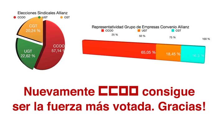 La Sección Sindical Estatal de CCOO en Allianz Seguros y Reaseguros S.A., queremos agradecer la confianza depositada en nuestras candidaturas y el reconocimiento hacia el trabajo realizado en estos casi cinco años de mandato, lo que nos ha permitido revalidar la mayoría aumentando 9 puntos en la comparativa con las elecciones realizadas hace ya casi cinco años.