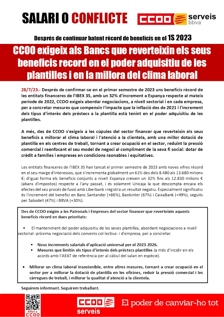 Després de confirmar-se en el primer semestre de 2023 uns beneficis rècord de les entitats financeres de l'IBEX 35, amb un 32% d'increment a Espanya respecte al mateix període de 2022, CCOO exigeix abordar negociacions, a nivell sectorial i en cada empresa, per a concretar mesures que compensin l'impacte que la inflació des de 2021 i l'increment dels tipus d'interès dels préstecs a la plantilla està tenint en el poder adquisitiu de les plantilles.