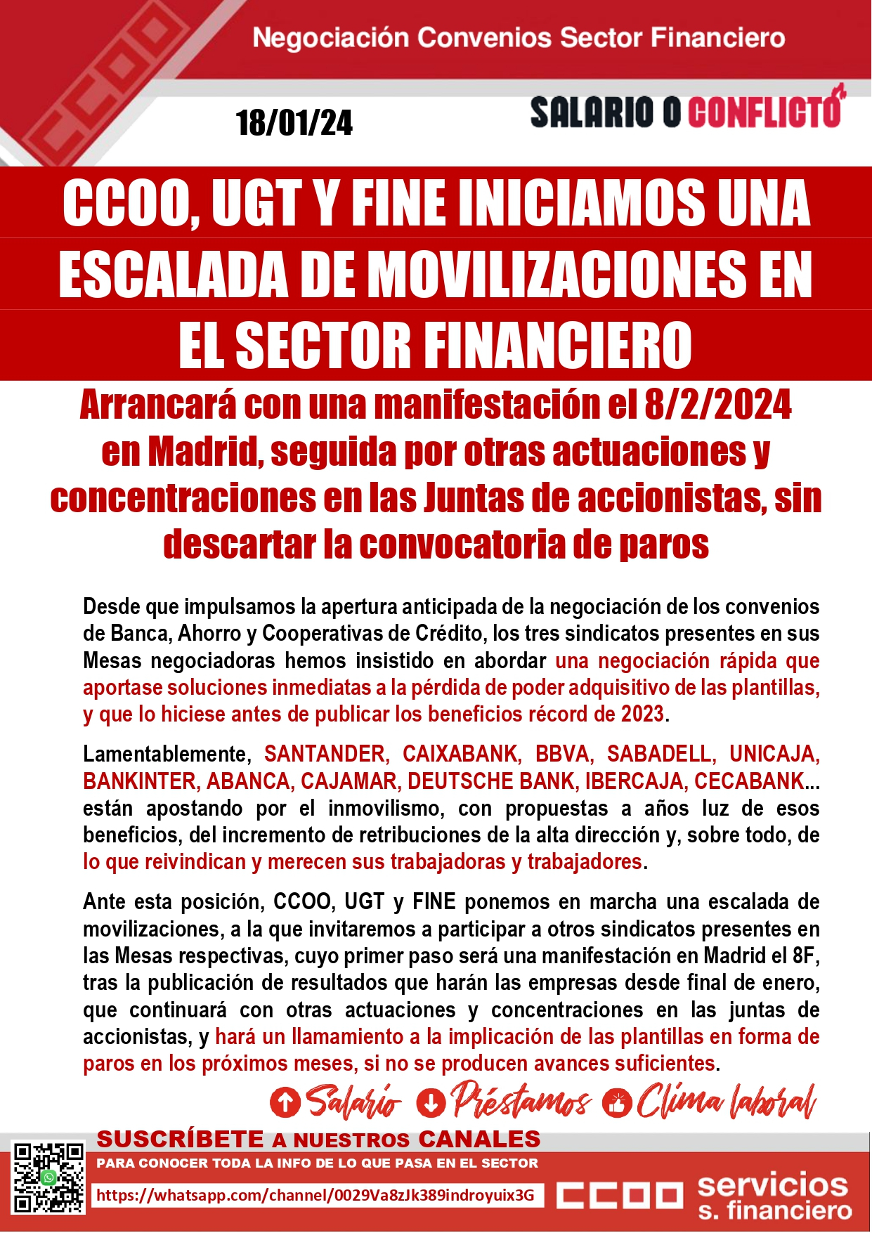 CCOO, UGT Y FINE INICIAMOS UNA ESCALADA DE MOVILIZACIONES EN EL SECTOR FINANCIERO
