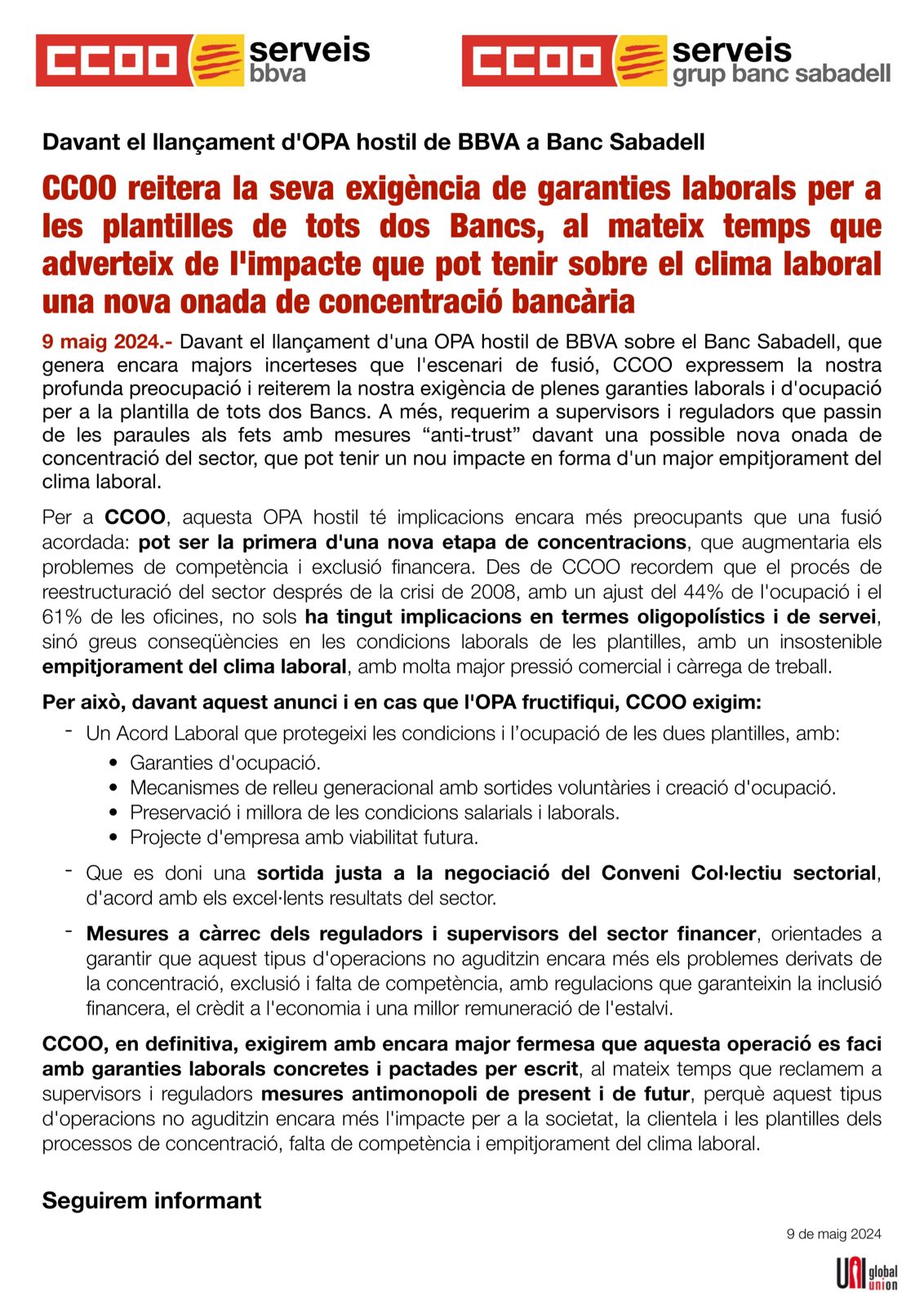 CCOO davant l\'OPA de BBVA a Banc Sabadell