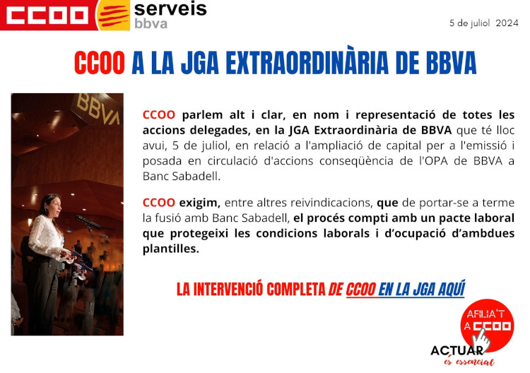 CCOO parlem alt i clar, en nom i representació de totes les accions delegades, en la JGA Extraordinària de BBVA