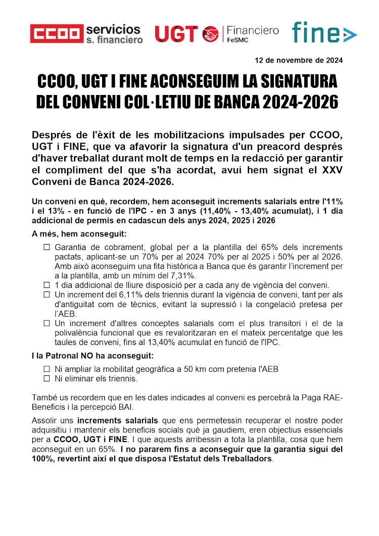 Després de l'èxit de les mobilitzacions impulsades per CCOO, UGT i FINE, que va afavorir la signatura d'un preacord després d'haver treballat durant molt de temps en la redacció per garantir el compliment del que s'ha acordat, avui hem signat el XXV Conveni de Banca 2024-2026.