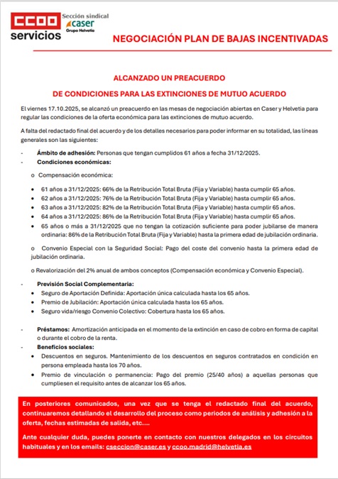 El viernes 17.10.2025, se alcanzó un preacuerdo en las mesas de negociación abiertas en Caser y Helvetia para regular las condiciones de la oferta económica para las extinciones de mutuo acuerdo.