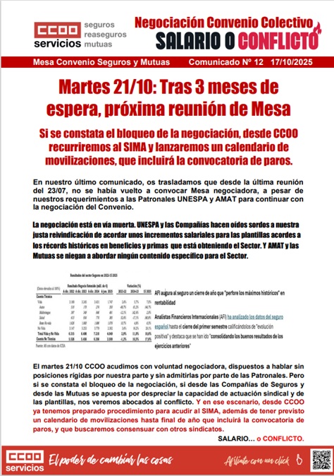 17.10.2025 - Tras 3 MESES DE ESPERA, próxima reunión de Mesa el 21.10. Si se constata el bloqueo de la negociación, desde CCOO recurriremos al SIMA y lanzaremos un calendario de movilizaciones, que incluirá la convocatoria de paros.
