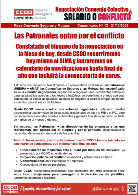 21.10.2025 - LAS PATRONALES OPTAN POR EL CONFLICTO. Constatado el bloqueo de la negociación en la Mesa de hoy, desde CCOO recurriremos hoy mismo al SIMA y lanzaremos un calendario de movilizaciones hasta final de año que incluirá la convocatoria de paros.