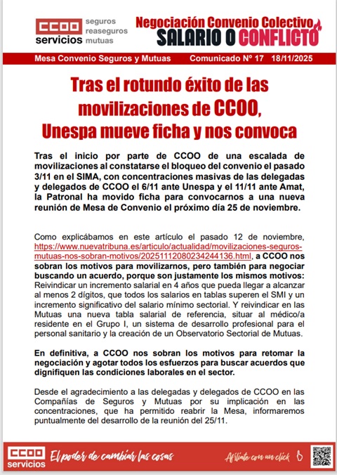 Tras el inicio por parte de CCOO de una escalada de movilizaciones al constatarse el bloqueo del convenio el pasado 3/11 en el SIMA, con concentraciones masivas de las delegadas y delegados de CCOO el 6/11 ante Unespa y el 11/11 ante Amat, la Patronal ha movido ficha para convocarnos a una nueva reunión de Mesa de Convenio el próximo día 25 de noviembre.