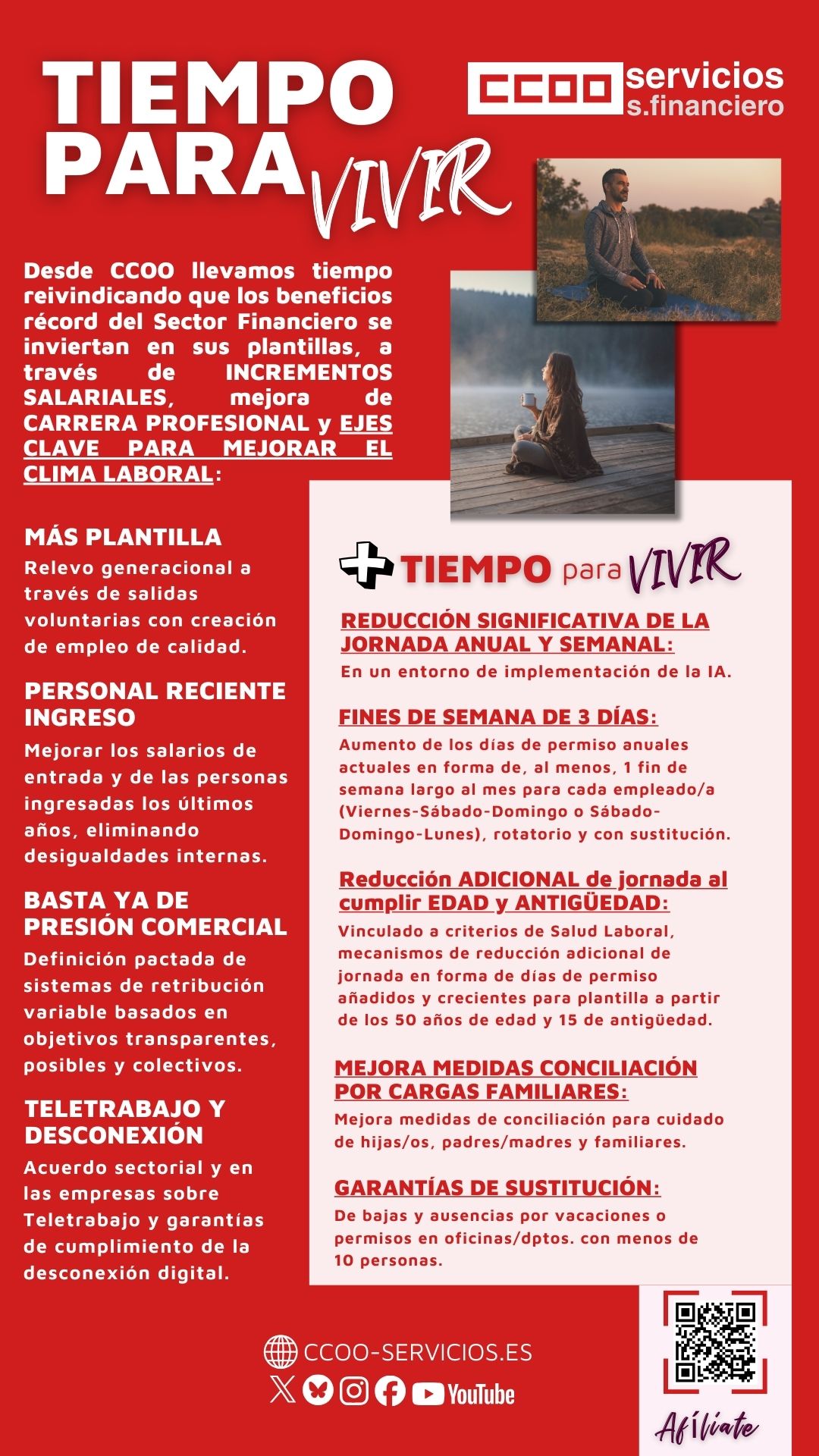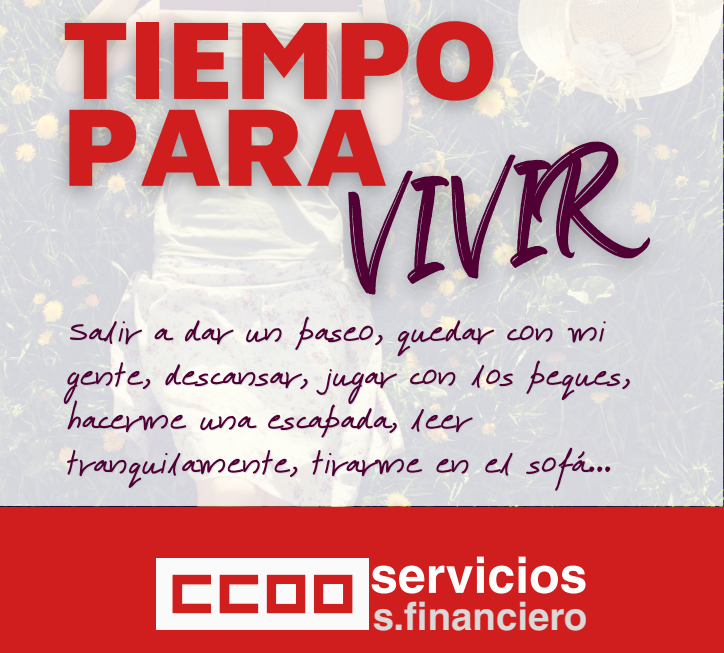 Mediante el díptico adjunto lanzamos una campaña que va a marcar nuestras reivindicaciones durante 2026 en cada empresa y en la negociación de los convenios del sector financiero a partir de 2027. Una campaña en la que exigimos + TIEMPO PARA VIVIR, en la que proponemos y reivindicamos, como puedes ver en el díptico adjunto, un aumento de los días de permiso anuales en forma de fines de semana de 3 días, reducciones adicionales de jornada al cumplir 50 años de edad y 15 de antigüedad, mejora de medidas de conciliación por cargas familiares y garantías de sustitución por vacaciones o permisos en oficinas/departamentos con menos de 10 personas.