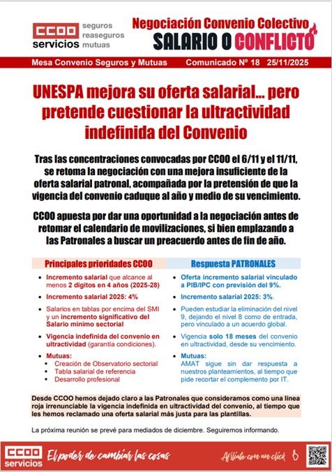 Tras las concentraciones convocadas por CCOO el 6/11 y el 11/11, se retoma la negociación con una mejora insuficiente de la oferta salarial patronal, acompañada por la pretensión de que la vigencia del convenio caduque al año y medio de su vencimiento. CCOO apuesta por dar una oportunidad a la negociación antes de retomar el calendario de movilizaciones, si bien emplazando a las Patronales a buscar un preacuerdo antes de fin de año.