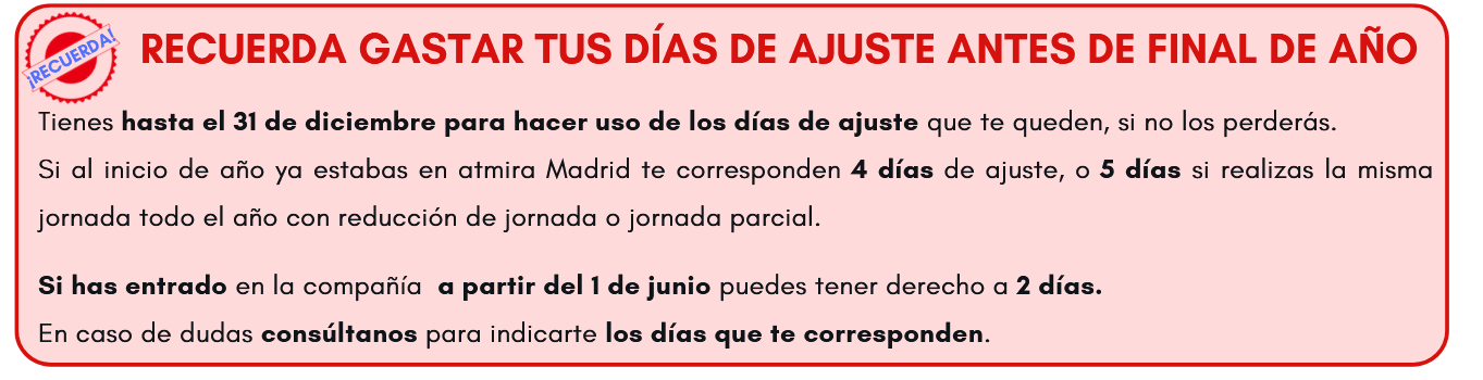 También queremos recordaros que mucha gente aun no ha gastado todos los días de ajuste, son como días de vacaciones, pero van en otra línea de imputación y si no los gastáis antes de fin de año los perdéis, os informamos con detalle de cuantos días tenéis y como hacer uso de ellos.