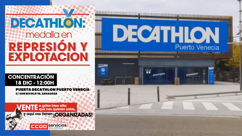 Por ello, y con el objetivo de dar visibilidad a la cara oculta de la multinacional francesa, CCOO Servicios ha convocado el 18 de diciembre un acto a las puertas del Decathlon del Centro Comercial Puerto Venecia en Zaragoza. Será una concentración-performance que combinará presencia de delegados y delegadas, elementos visuales de protesta y la lectura de un manifiesto.