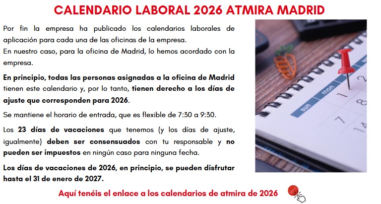 Os informamos que ya se ha publicado en 4you el calendario laboral de atmira Madrid de 2026. Para vuestra facilidad os incluimos el enlace.