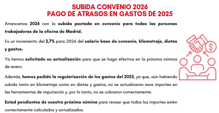 Aprovechamos para recordar que empezamos 2026 con subida de convenio. Debe aplicarse conforme a lo establecido, con los efectos económicos que correspondan. Y, recordamos que la empresa debe regularizar los gastos correspondientes a 2025, ya que los kilometrajes y dietas no fueron correctamente calculados.