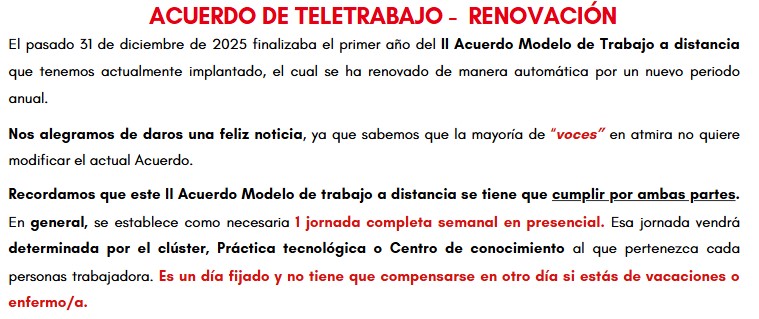 Para tranquilidad de todas las personas trabajadoras, confirmamos que seguimos con el mismo acuerdo de teletrabajo, ya que ha sido renovado para todo el año 2026, sin cambios respecto a lo ya acordado.