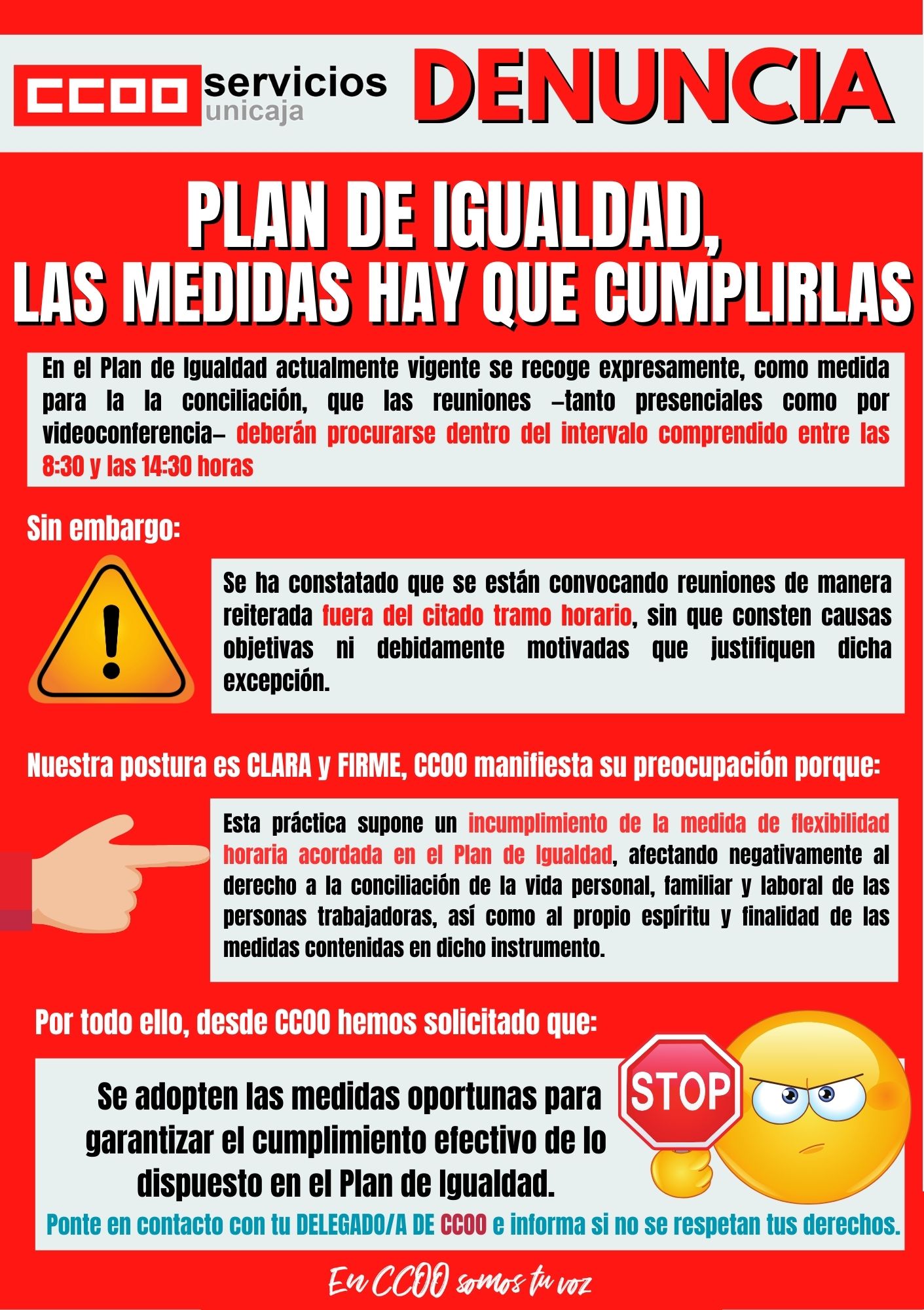 En el Plan de Igualdad actualmente vigente se recoge expresamente, como medida para la la conciliación, que las reuniones —tanto presenciales como por videoconferencia— deberán procurarse dentro del intervalo comprendido entre las 8:30 y las 14:30 horas.