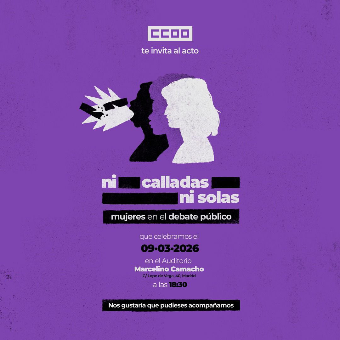 Por último, el lunes 9 de marzo, a las 18.30hs, Comisiones Obreras va a celebrar el Acto Ni calladas ni solas', con el que se pretende dar un paso adelante para acompañar y mostrar apoyo a las mujeres periodistas, divulgadoras, comunicadoras, creadoras de contenido, que son víctimas de distintas campañas de hostigamiento.