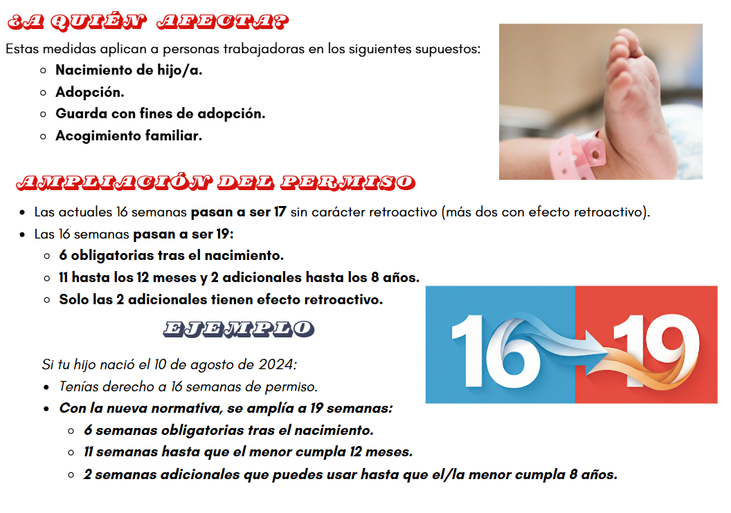Estas medidas, recogidas en la normativa estatal, suponen avances significativos en los derechos de las personas trabajadoras en situaciones de nacimiento, adopción, guarda con fines de adopción y acogimiento.