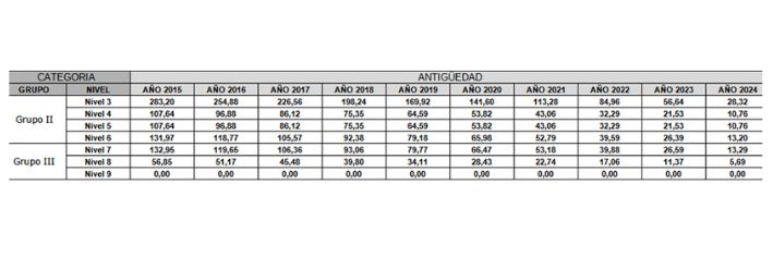 A continuación os adjuntamos unas tablas salariales para que podáis validar los importes que os corresponden en concepto de PLUS EXPERIENCIA en virtud de vuestra antigüedad y categoría: