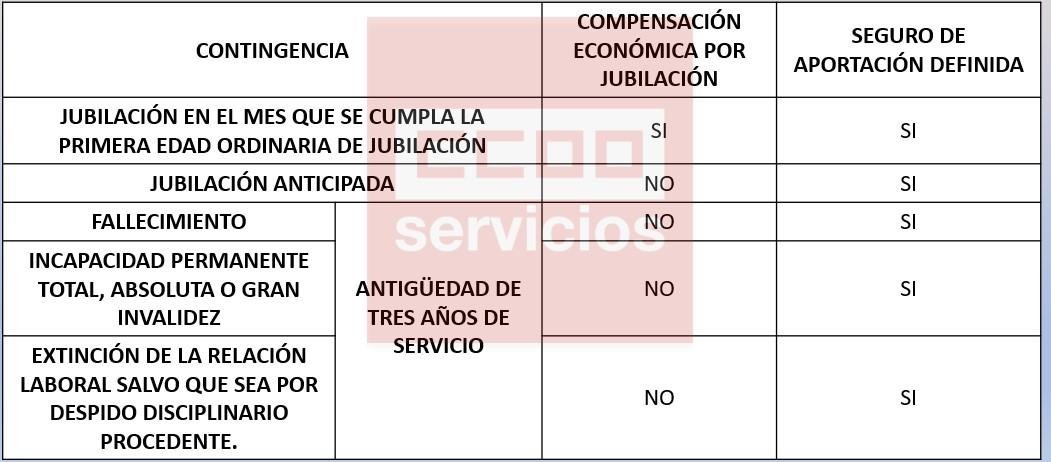 En el siguiente cuadro recogemos como quedaría, en función de la contingencia por la que se produzca la extinción laboral, el derecho al cobro de la compensación económica por jubilación y del seguro de aportación definida.